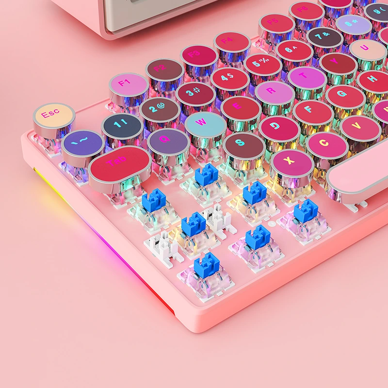 Механічная гульнявая клавіятура HUO JI у стылі пішучай машынкі з бакавым RGB-падсветкай і вясёлкавай падсветкай у стылі рэтра, сінія перамыкачы, 104 клавішы, ружовы