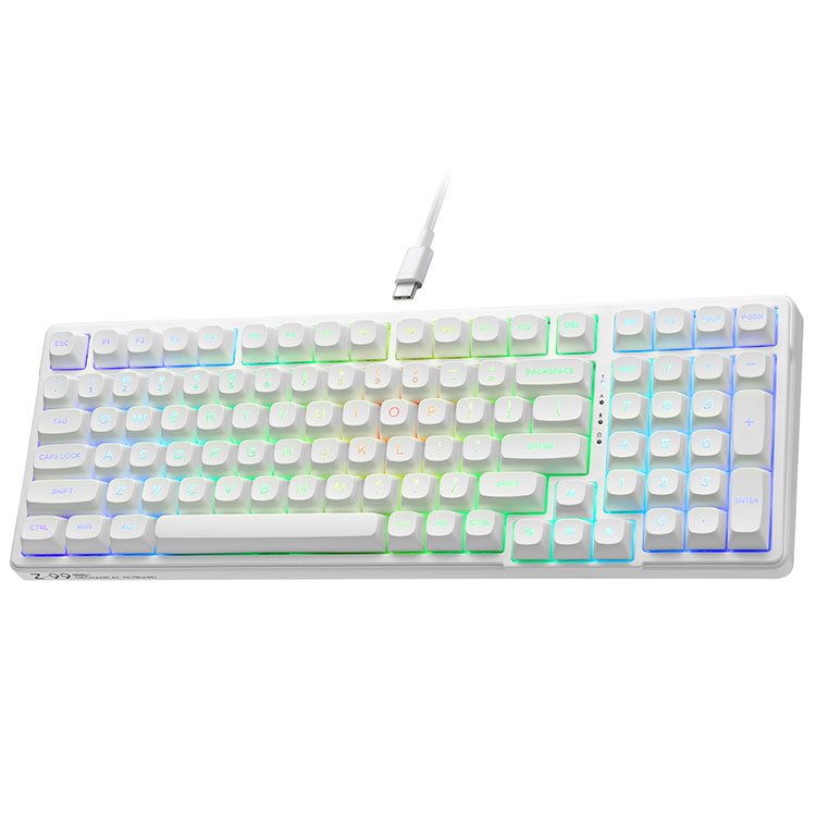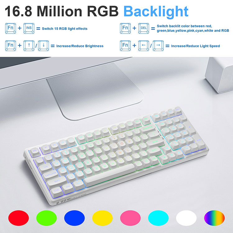 · 【Класны эфект падсветкі RGB】Клавіятура Z-99 RGB уключае 15 эфектаў падсвятлення і 8 пераключэння колераў падсветкі. Розныя налады RGB павялічаць ваш час на ўвод. Хуткасць і ўзровень асвятлення таксама можна рэгуляваць у адпаведнасці з вашымі патрэбамі. Двайны стрэл Injection PBT Keycaps, персанаж ніколі не знікне.