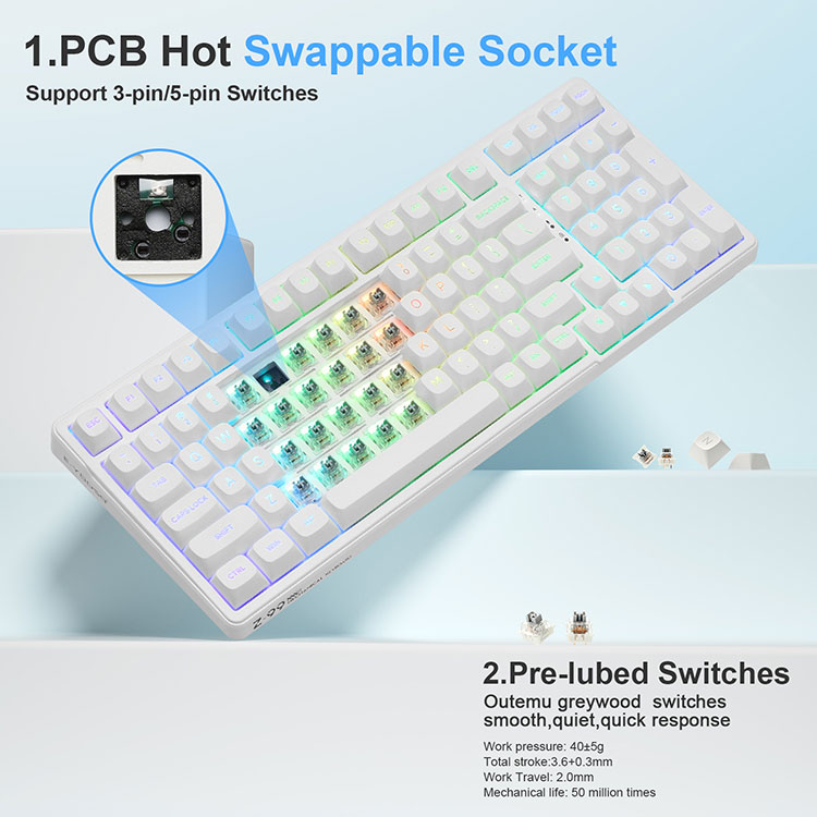 · 【Карыстальніцкая клавіятура з магчымасцю гарачай замены】Перамыкачы і каўпачкі клавіш можна свабодна замяняць (крышка кнопак/здымнік пераключальнікаў уключаны ў камплект). Гэтая наладжвальная клавіятура з друкаванай платай з функцыяй гарачай замены дазваляе карыстальнікам лёгка замяняць 3-кантактныя/5-кантактныя перамыкачы без праблем з пайкай. Механічныя клавіятуры Z-99, абсталяваныя папярэдне змазанымі лінейнымі перамыкачамі, ствараюць гладкае адчуванне набору тэксту і прыемны гук набору тэксту, забяспечваюць хуткі адказ для захапляльнай гульні.