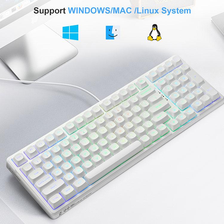 · 【99 КЛЮЧАЎ ПОЎНАЯ РАСХОДКА】Раскладка з 99 клавіш памяншае памер да 39x13,5x4 см, адначасова забяспечваючы поўную функцыянальнасць клавіятуры. У спалучэнні з кабелем USB-C (падключэнне клавіятуры) да USB-A (падключэнне ПК) клавіятура можа зэканоміць месца на працоўным стале, павысіць эфектыўнасць працы і гульнявую прадукцыйнасць.