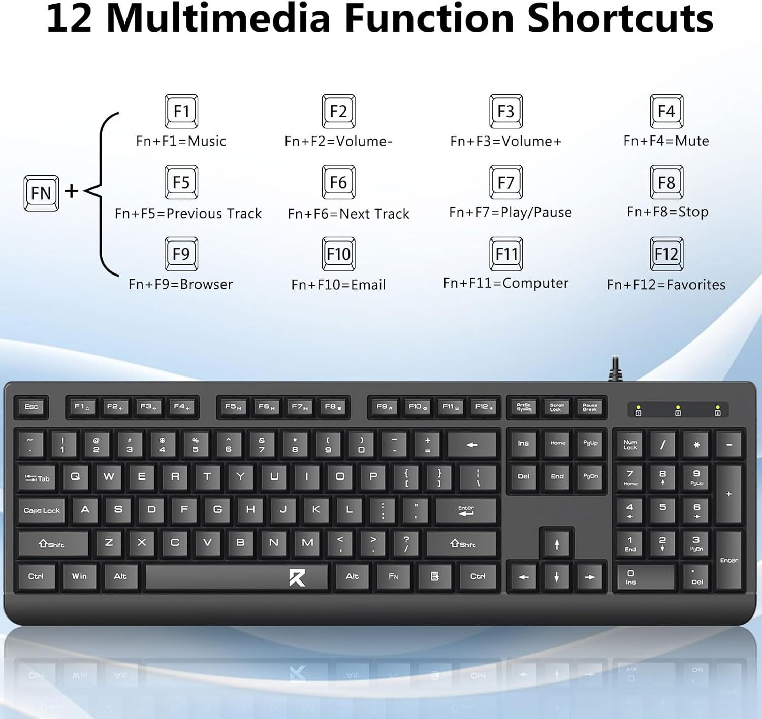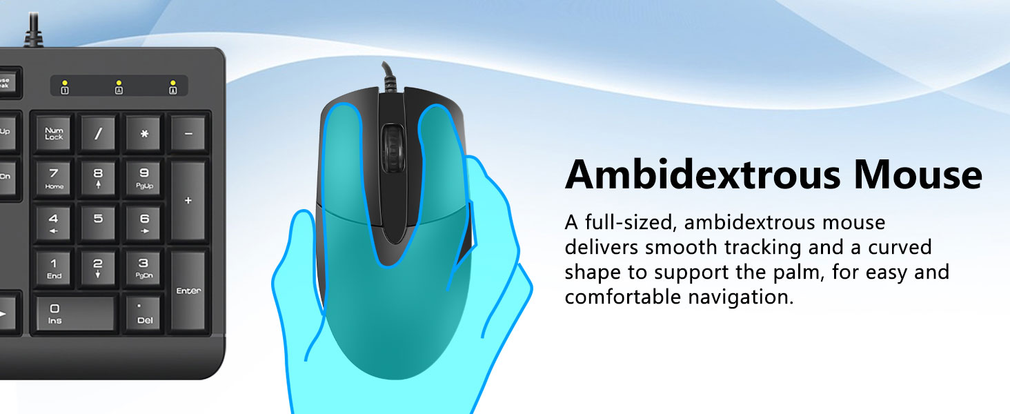 Поўнапамерная раскладка клавіятуры ўключае лічбавую клавіятуру, мультымедыйныя клавішы і зручную адлегласць паміж клавішамі. Мыш, якая ідзе ў камплекце, прызначана для дакладнага адсочвання і плыўнага перамяшчэння курсора па розных паверхнях.