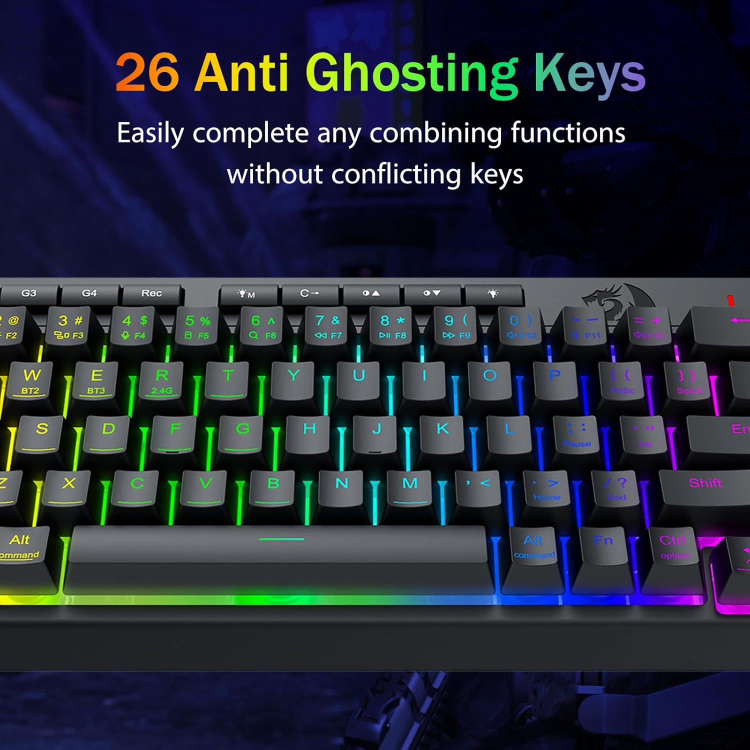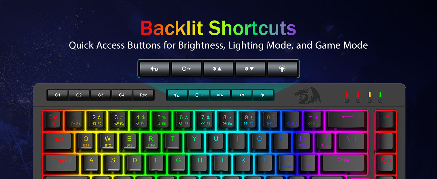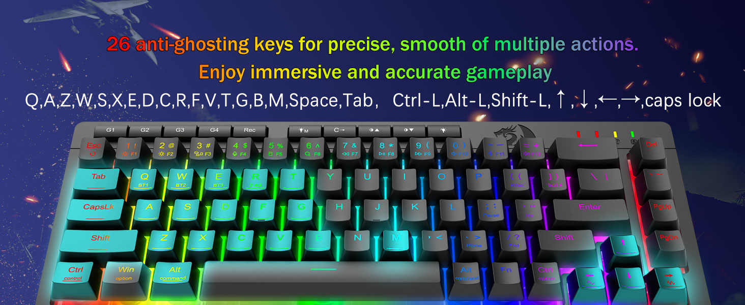 Гульнявая прадукцыйнасць Pro-Grade і спецыяльныя элементы кіравання з падсветкай -Уключае клавішы супраць фантозу (клавішы з падкрэсліваннем), якія дазваляюць адначасова працаваць 26 клавішам для хуткай і дакладнай рэакцыі ў гульні, як вы задумалі. Кнопкі хуткага доступу для яркасці, рэжыму асвятлення і гульнявога рэжыму, каб хутка наладзіць яркасць, профілі асвятлення і ўключыць гульнявы рэжым адным націскам кнопкі.