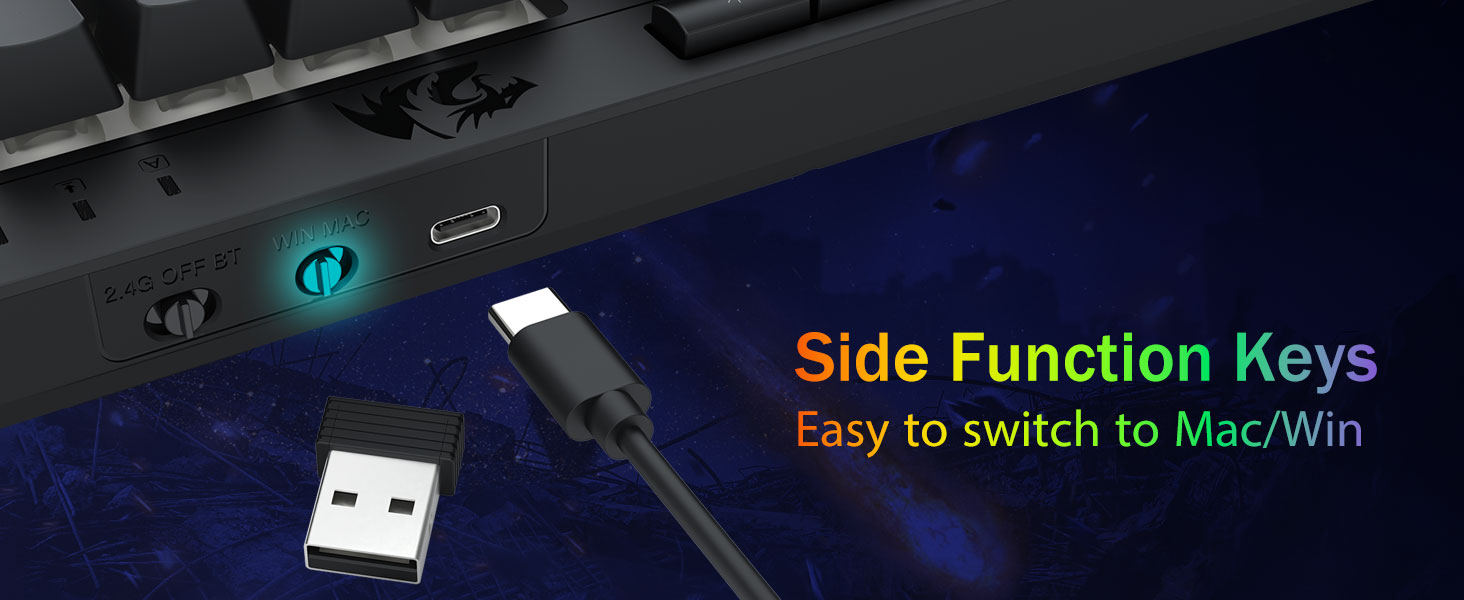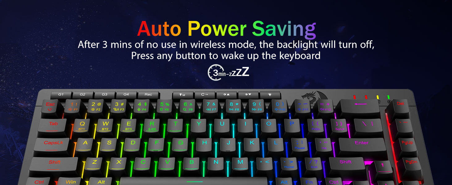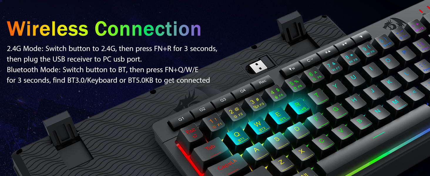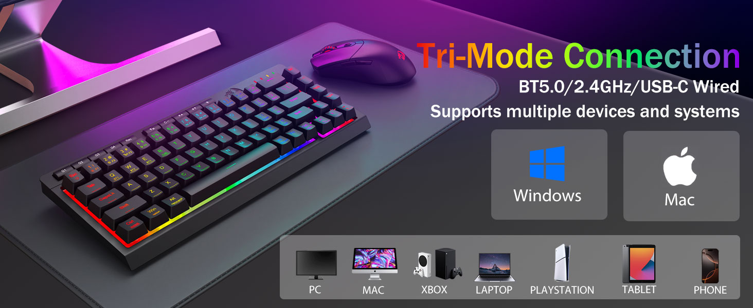 Універсальнасць трох рэжымаў і валоданне некалькімі прыладамі -Плаўна пераключайцеся паміж бесправадным рэжымам Bluetooth 5.0, 2,4 ГГц або правадным USB-C, падключаючы да 5 прылад адначасова (ПК, Mac, планшэты, тэлефоны, PS/XBOX). Лёгка перамыкайце прылады з дапамогай спалучэння клавіш або бакавой кнопкі — ідэальна падыходзіць для гібрыдных налад працы/гульні. Заставайцеся зараджанымі тыднямі з акумулятарам ёмістасцю 4000 мАг (30+ дзён у рэжыме чакання, 50 гадзін працы RGB).