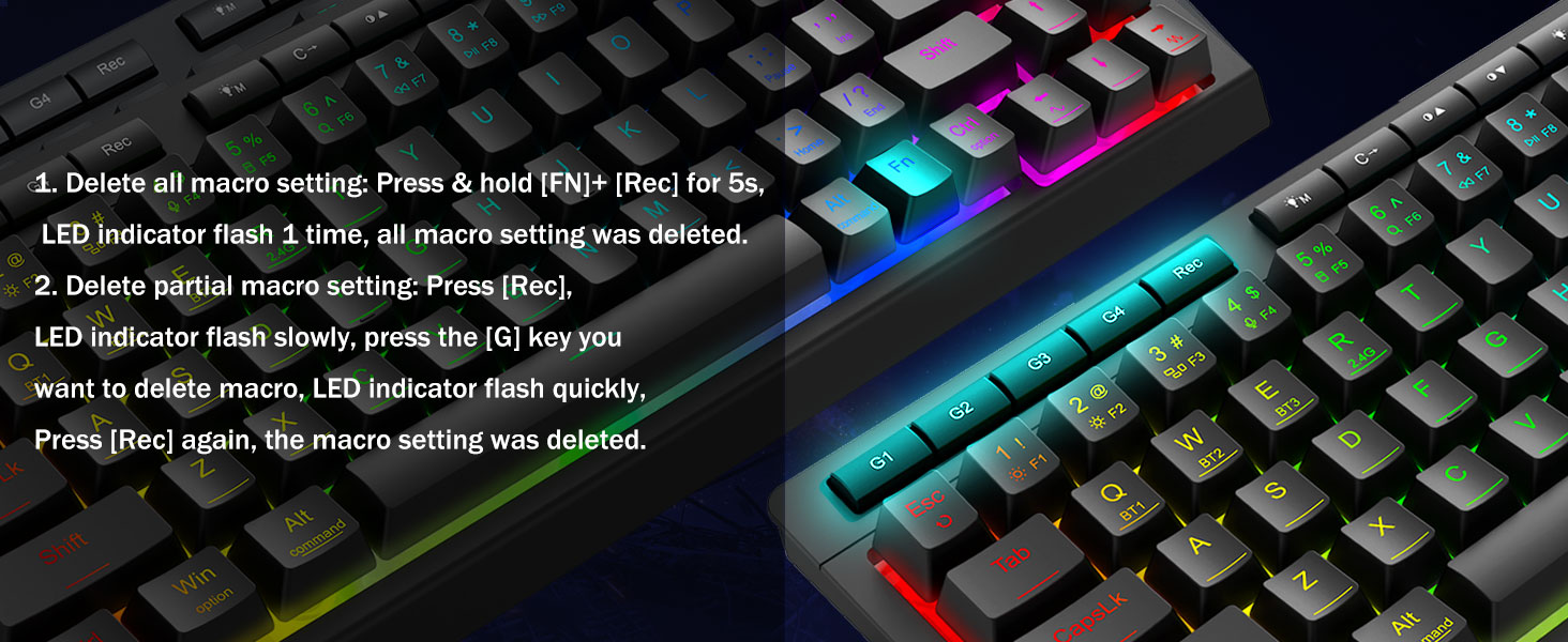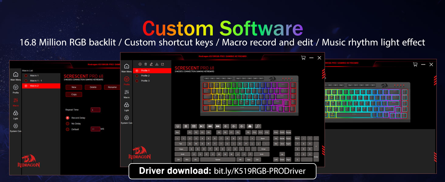 Наладжвальныя макрасы, лёгкае кіраванне -Імгненна запраграмуйце 4 убудаваныя макраклавішы (G1-G4) — праграмнае забеспячэнне не патрабуецца. Запісвайце складаныя камбінацыі для гульняў, цэтлікі для павышэння прадукцыйнасці або мультымедыйныя каманды. Пераасэнсуйце свой працоўны працэс за лічаныя секунды. Вы таксама можаце выкарыстоўваць праграмнае забеспячэнне для наладжвання функцый, стварэння макрасаў, рэгулявання RGB-падсветкі і ўстаноўкі ярлыкоў. Спасылка на праграмнае забеспячэнне: bit.ly/K524RGB-PRODriver