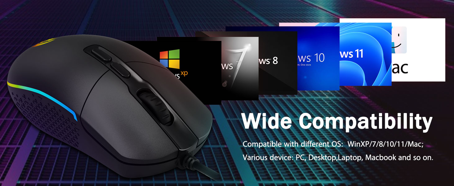 Выбар зацятых геймераў- Калі вы цэліцеся, цэліцеся, сячэце або атакуеце, прафесійная гульнявая мыш - ваша лепшая зброя! Мышка будзе вашым ідэальным партнёрам. Ідэальна сумяшчальны з Windows XP/Vista/Win7/Win8/Win10/ME/2000/Mac і г.д.