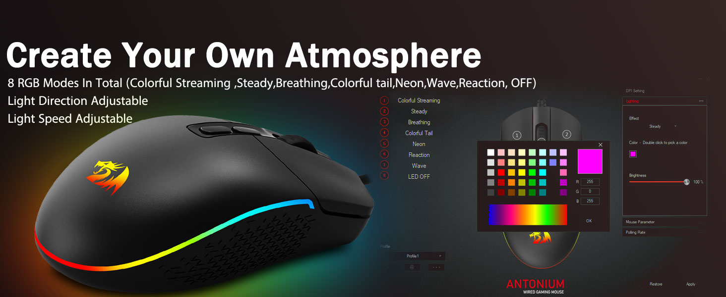 8 прыстойных рэжымаў падсветкі RGB- Уключыце падсвятленне і зрабіце некалькі забойстваў на гульнявым полі бою. Раскручаная дынамічная атмасфера RGB з падсветкай ніколі не падвядзе вас пры афармленні гульнявой прасторы, было б лепш з іншымі аксэсуарамі Redragon з уключаным святлом.