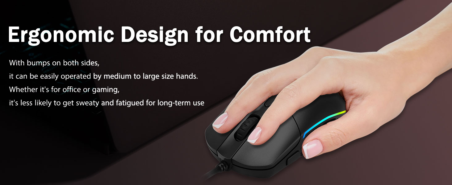 Камфортная ручка- Эрганамічныя выступы з абодвух бакоў дазваляюць змяшчаць гульнявую мыш у любыя рукі. Гэта забяспечвае працяглы камфорт для гульцоў, без стомленасці нават падчас доўгіх гадзін інтэнсіўнай гульні. Ён не будзе саслізгваць пры падняцці гульнявой мышы або пры хуткім і дакладным правядзенні.