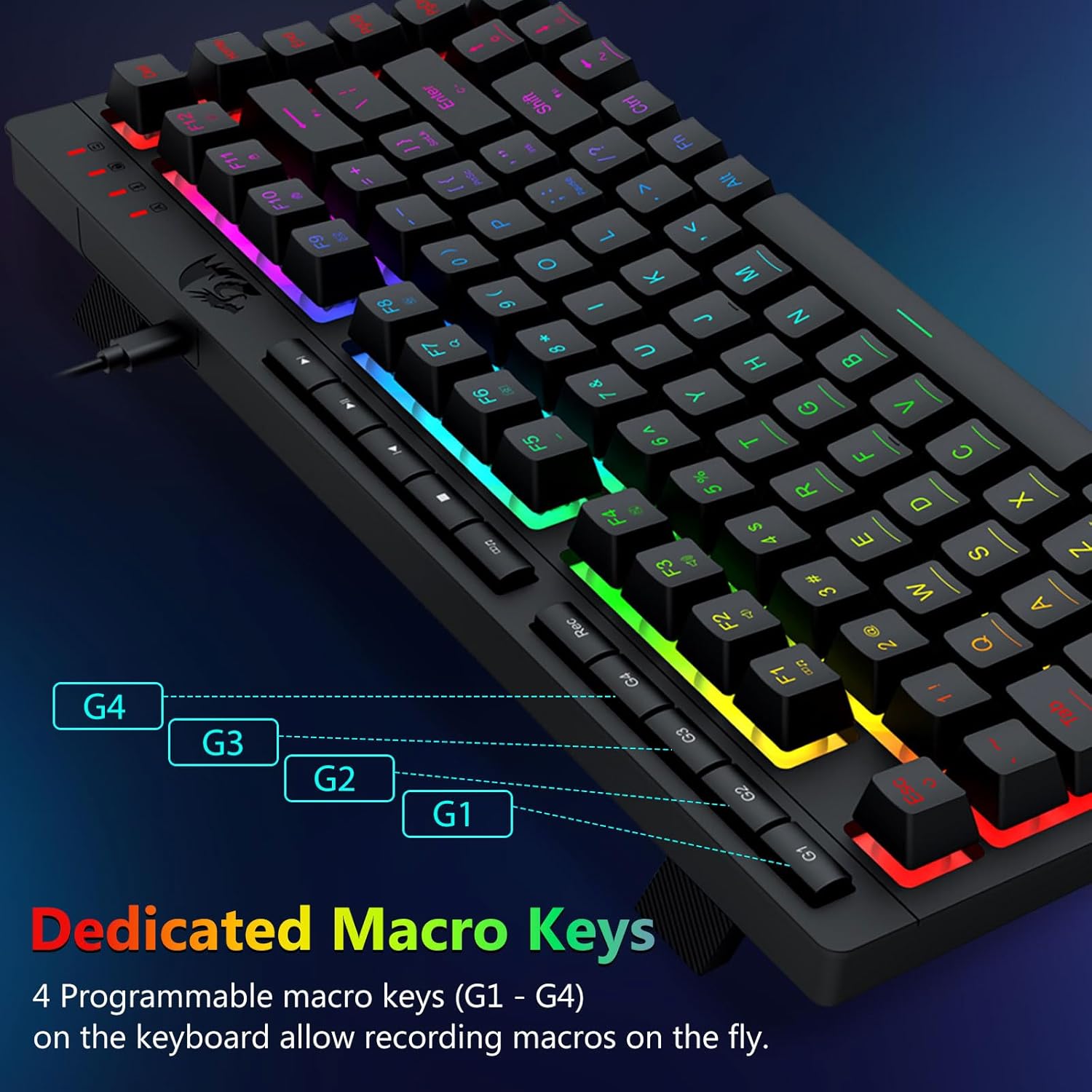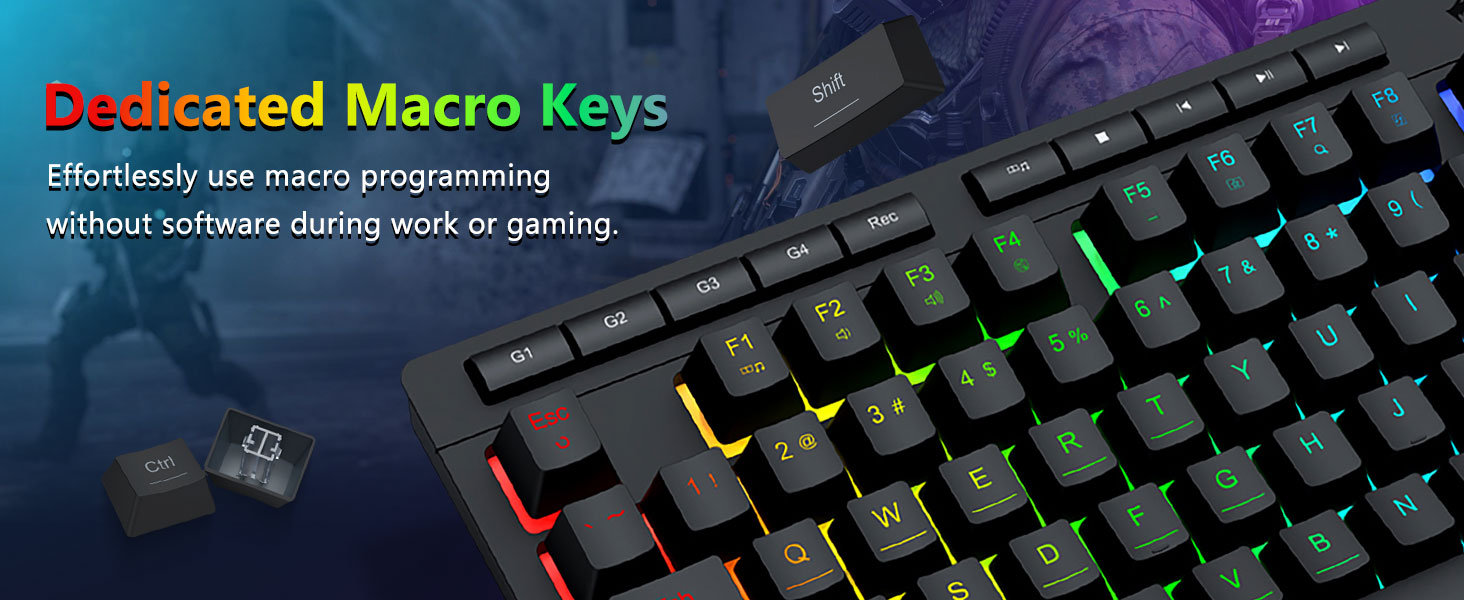 【Эфектыўнае і зручнае】Гэтая гульнявая камбінацыя клавіятуры і мышы абсталявана 4 убудаванымі макраклавішамі, 5 незалежнымі мультымедыйнымі клавішамі і 12 мультымедыйнымі функцыянальнымі клавішамі FN, простымі і зручнымі ў выкарыстанні. Гэта не толькі павышае эфектыўнасць, але і робіць ваш гульнявы працэс больш зручным і хуткім