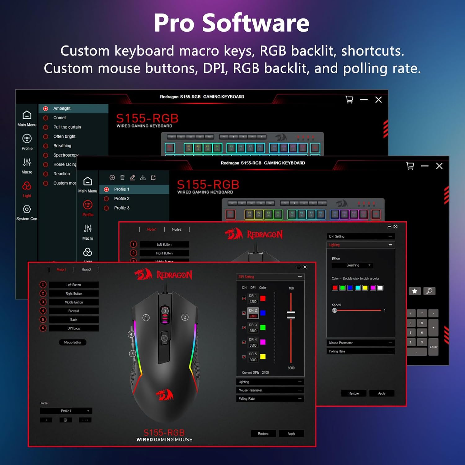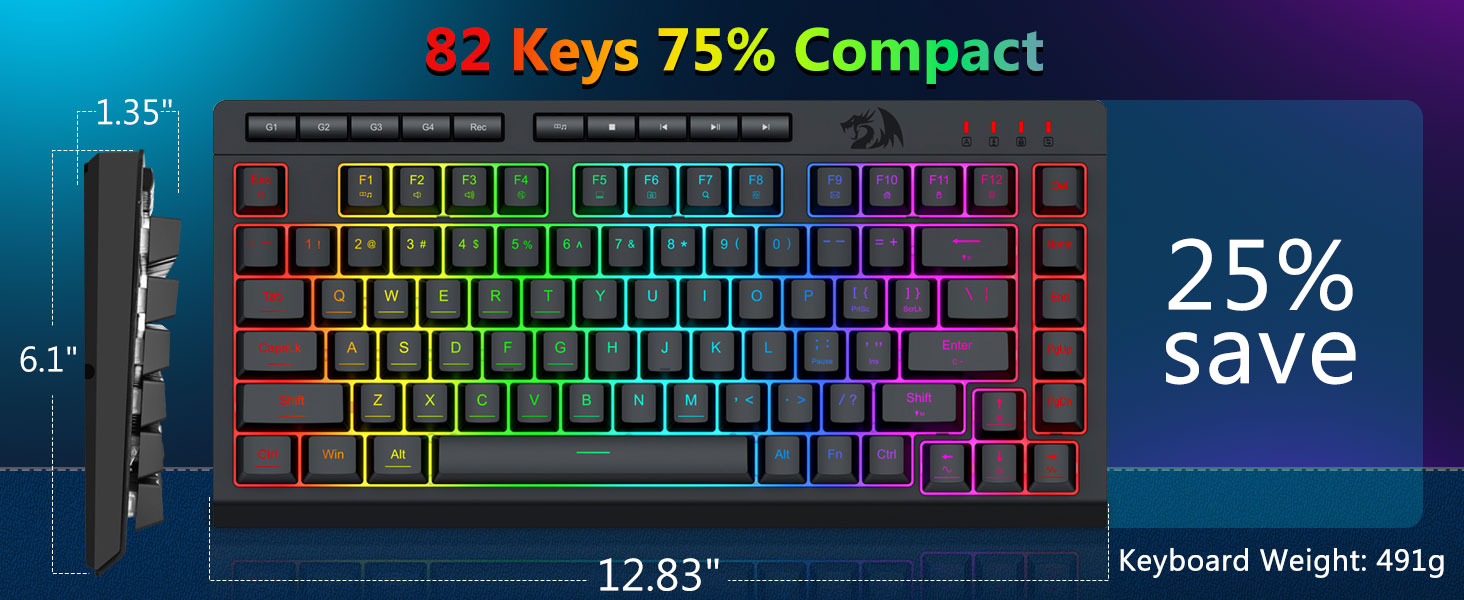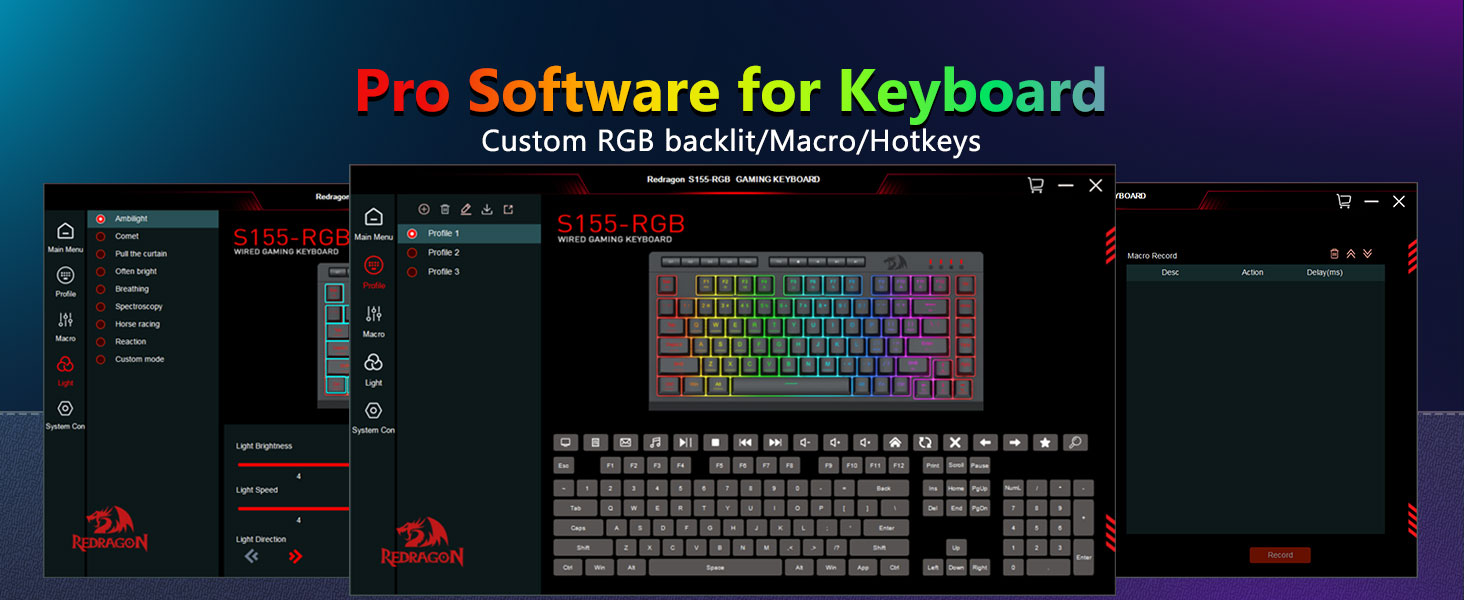 【Гульнявая клавіятура і мыш RGB】Гульнявая клавіятура мае 8 рэжымаў асвятлення RGB на выбар, а гульнявая мыш мае 8 светлавых эфектаў для пераключэння, і клавіятура можа быць адрэгулявана для 4 узроўняў хуткасці і яркасці ў адпаведнасці з вашымі перавагамі. Клавіятуры забяспечваюць выразную раўнамерную падсвятленне. Незалежна ад таго, ці з'яўляецца набор адным святлом, змяняючыміся светлавымі эфектамі або зусім без святла, гульнявая клавіятура і мыш Redragon адпавядаюць вашым патрэбам!