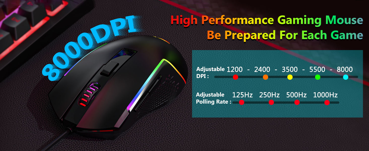 【Прафесійная гульнявая мыш】Вы можаце наладзіць DPI ад 1200 да 8000 з дапамогай кнопкі DPI або ад 100 да 8000 з дапамогай праграмнага драйвера, каб лёгка задаволіць вашыя розныя патрэбы ў гульнях або працы. Усяго 7 кнопак, з якіх 6 можна запраграмаваць. Высокадакладны датчык забяспечвае максімальную дакладнасць, у той час як гульнявыя мікраперамыкачы забяспечваюць даўгавечнасць, вялікую трываласць і надзвычайную хуткасць рэагавання, даючы вам яшчэ большую перавагу перад канкурэнтамі. (Праграмнае забеспячэнне таксама падтрымлівае рэгуляванне частаты апытання мышы да 1000 Гц)