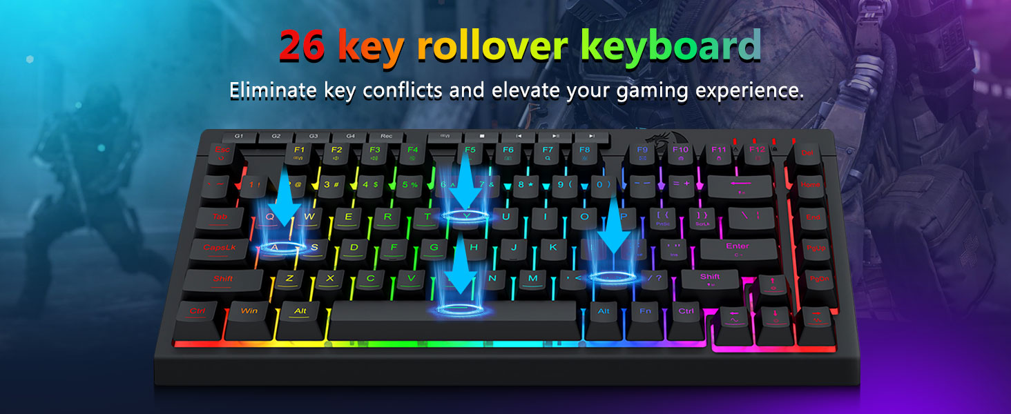【Зручная гульня】Складаная падстаўка клавіятуры, зручнае для скуры пакрыццё і плаваючыя каўпачкі для клавіш павышаюць камфорт набору тэксту. 26 клавіш Anti-ghosting гарантуюць, што кожная кнопка можа быць запушчана. Ключ WIN можа быць адключаны для гульні. Гэтая клавіятура і мыш прызначаны для забеспячэння эфектыўнага гульнявога вопыту пры забеспячэнні максімальнага камфорту