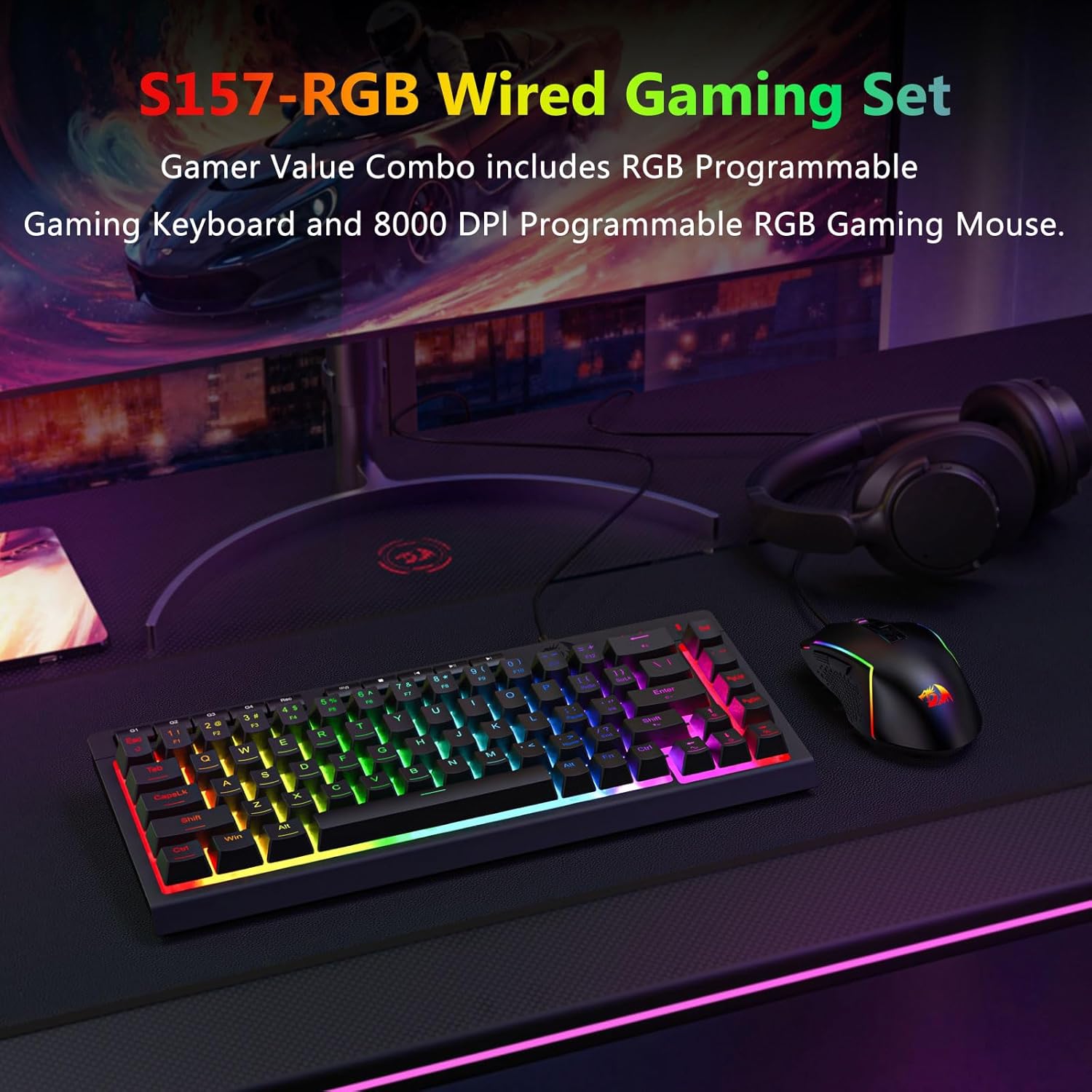 Надзейная клавіятура і мыш неабходныя як для гульнявой прадукцыйнасці, так і для штодзённай прадукцыйнасці. Чорная правадная гульнявая клавіятура і мыш з падсветкай S157 RGB распрацавана, каб забяспечыць стабільны ўвод, практычную функцыянальнасць і чысты знешні выгляд працоўнага стала. Спалучаючы поўнапамерную клавіятуру з хуткай аптычнай мышшу, гэты набор падтрымлівае шырокі спектр прыкладанняў, ад гульнявых сесій да офісных задач.