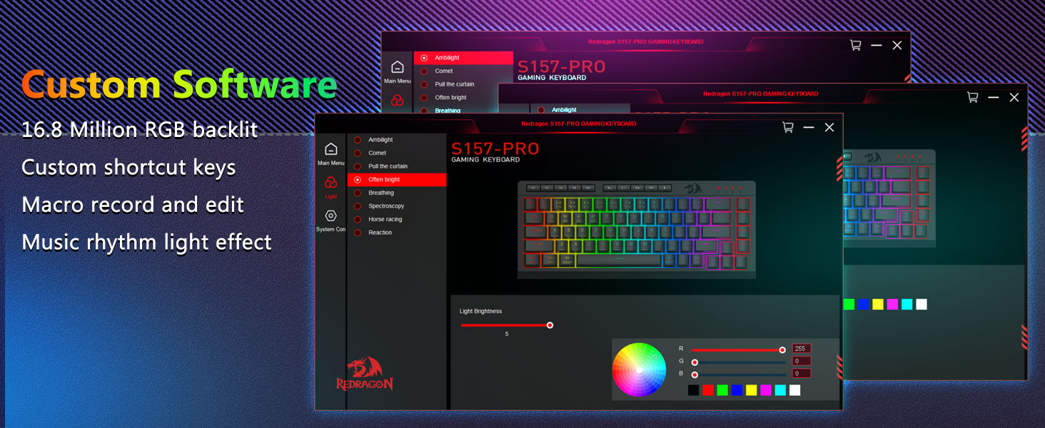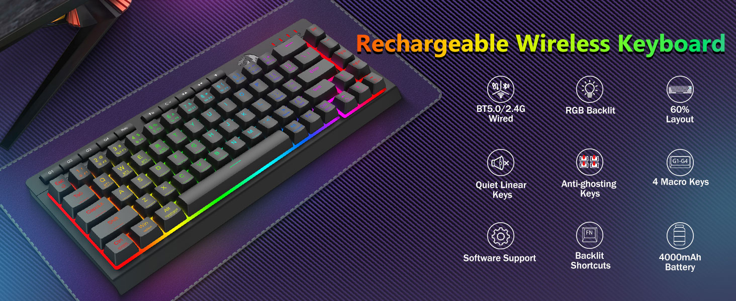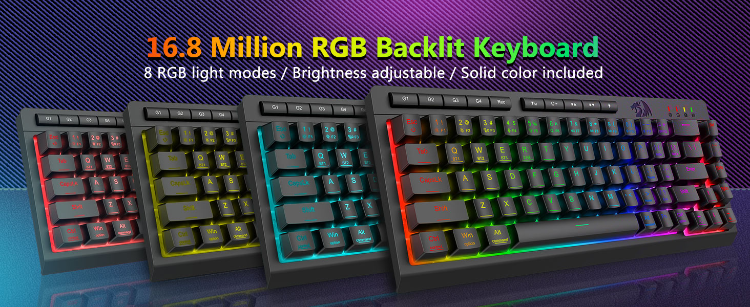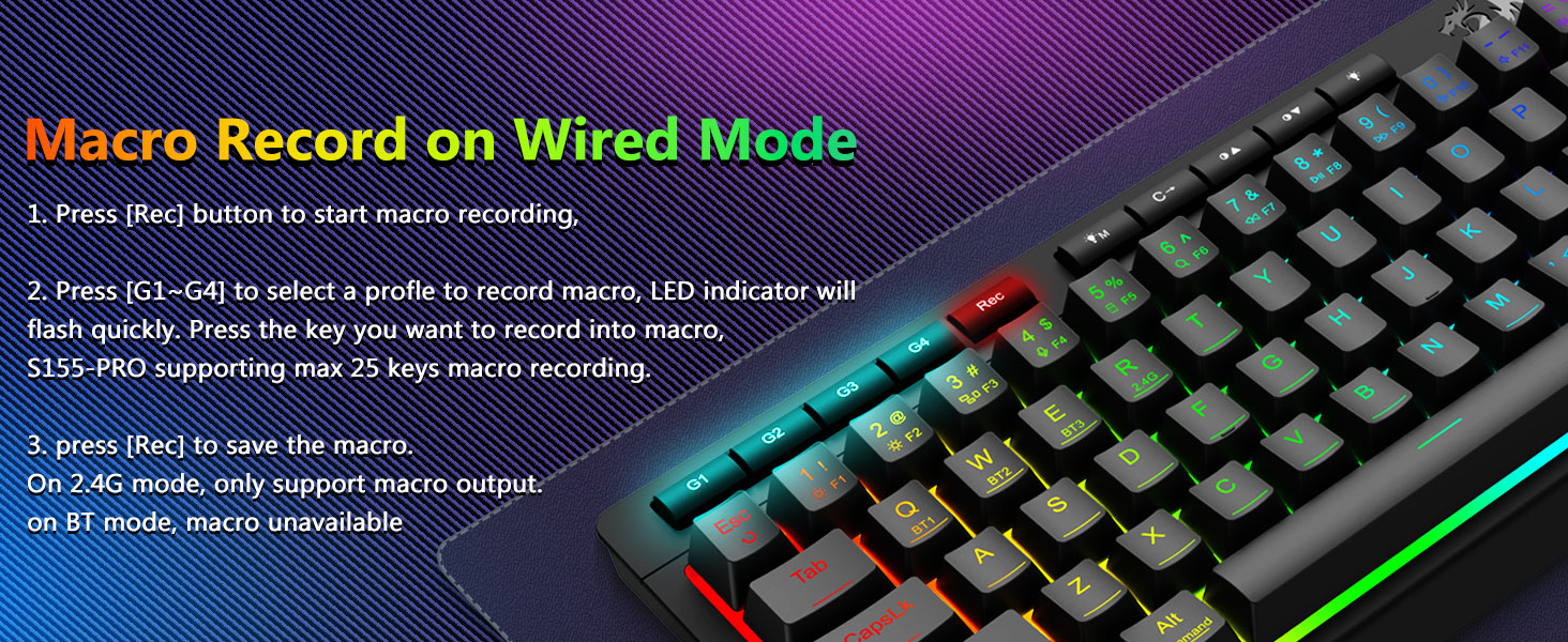 Наладжвальныя макрасы, спецыяльныя элементы кіравання з падсветкай- Імгненна запраграмуйце 4 убудаваныя макраклавішы (G1-G4) - праграмнае забеспячэнне не патрабуецца. Запісвайце складаныя камбінацыі для гульняў, цэтлікі для павышэння прадукцыйнасці або мультымедыйныя каманды. Пераасэнсуйце свой працоўны працэс за лічаныя секунды. Вы таксама можаце выкарыстоўваць праграмнае забеспячэнне для наладжвання функцый, стварэння макрасаў, рэгулявання RGB-падсветкі і ўстаноўкі ярлыкоў. Уключае клавішы супраць фантозу (клавішы з падкрэсліваннем), якія дазваляюць адначасова працаваць 26 клавішам для хуткай і дакладнай рэакцыі ў гульні, як вы задумалі. Кнопкі хуткага доступу для яркасці, рэжыму асвятлення і гульнявога рэжыму, каб хутка наладзіць яркасць, профілі асвятлення і ўключыць гульнявы рэжым адным націскам кнопкі.