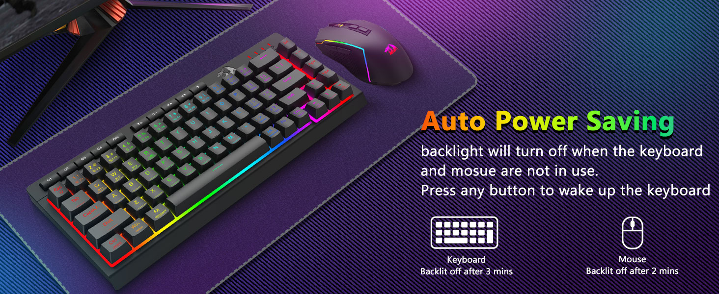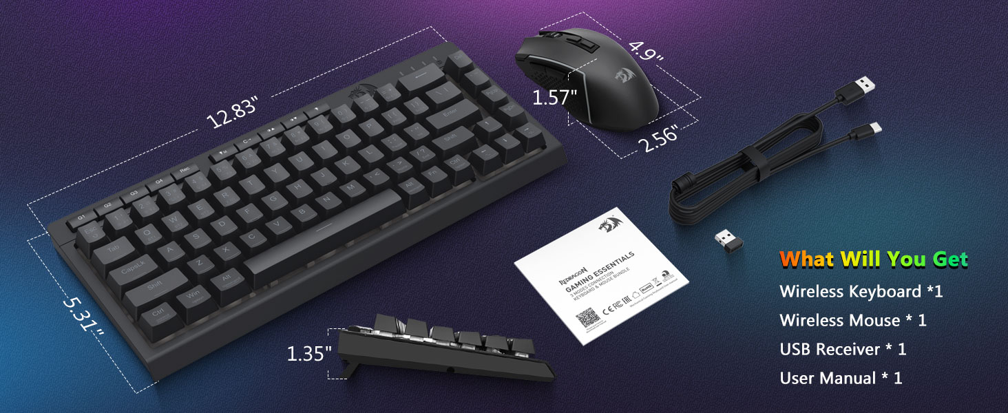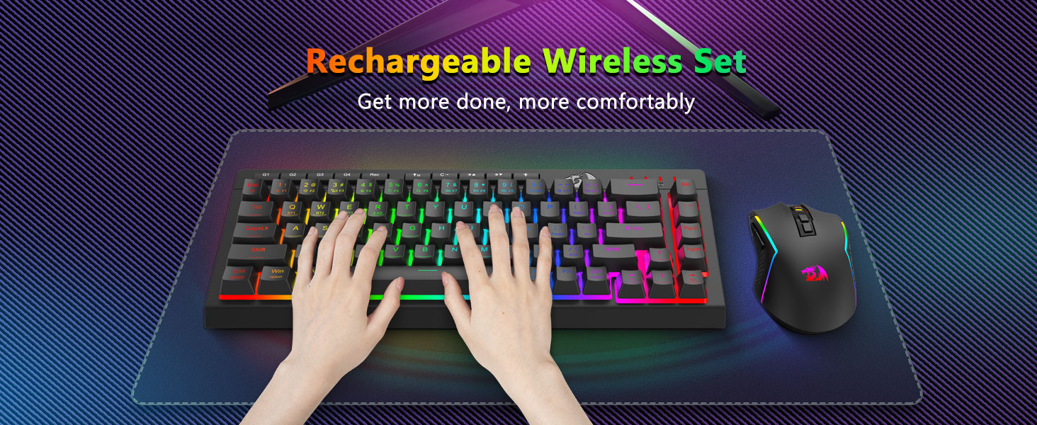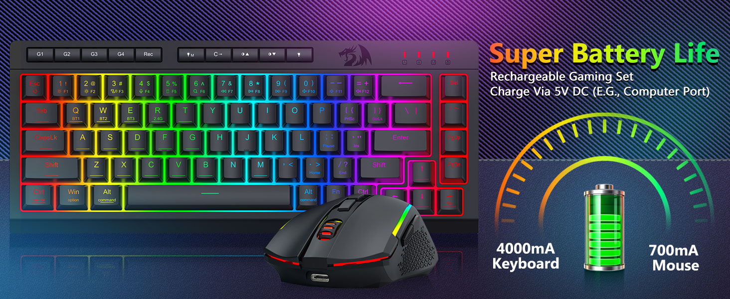 Чорная бесправадная гульнявая клавіятура і мыш S157 Combo ад Redragon, умела створаная прафесійным вытворцам Chuangquan, распрацавана, каб палепшыць прадукцыйнасць і стыль вашай гульнявой станцыі. Клавіятура забяспечвае задавальняючую тактыльную рэакцыю, што ідэальна падыходзіць як для інтэнсіўных гульнявых марафонаў, так і для працяглых сеансаў набору тэксту, у той час як мыш забяспечвае высокую дакладнасць з дапамогай рэгуляваных налад DPI для цудоўнага кантролю ў гульні. Абодва кампаненты абсталяваны захапляльнай падсветкай RGB, што дазваляе вам наладзіць атмасферу вашай ўстаноўкі з дапамогай спектру колераў і дынамічных эфектаў.