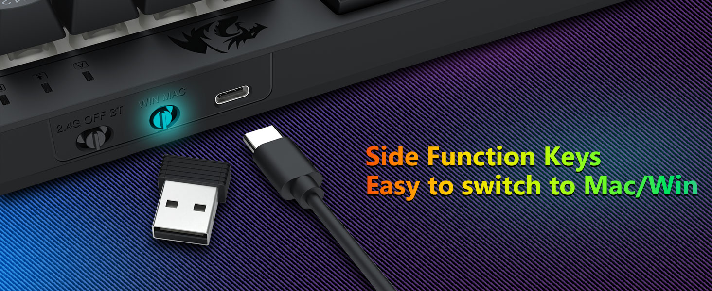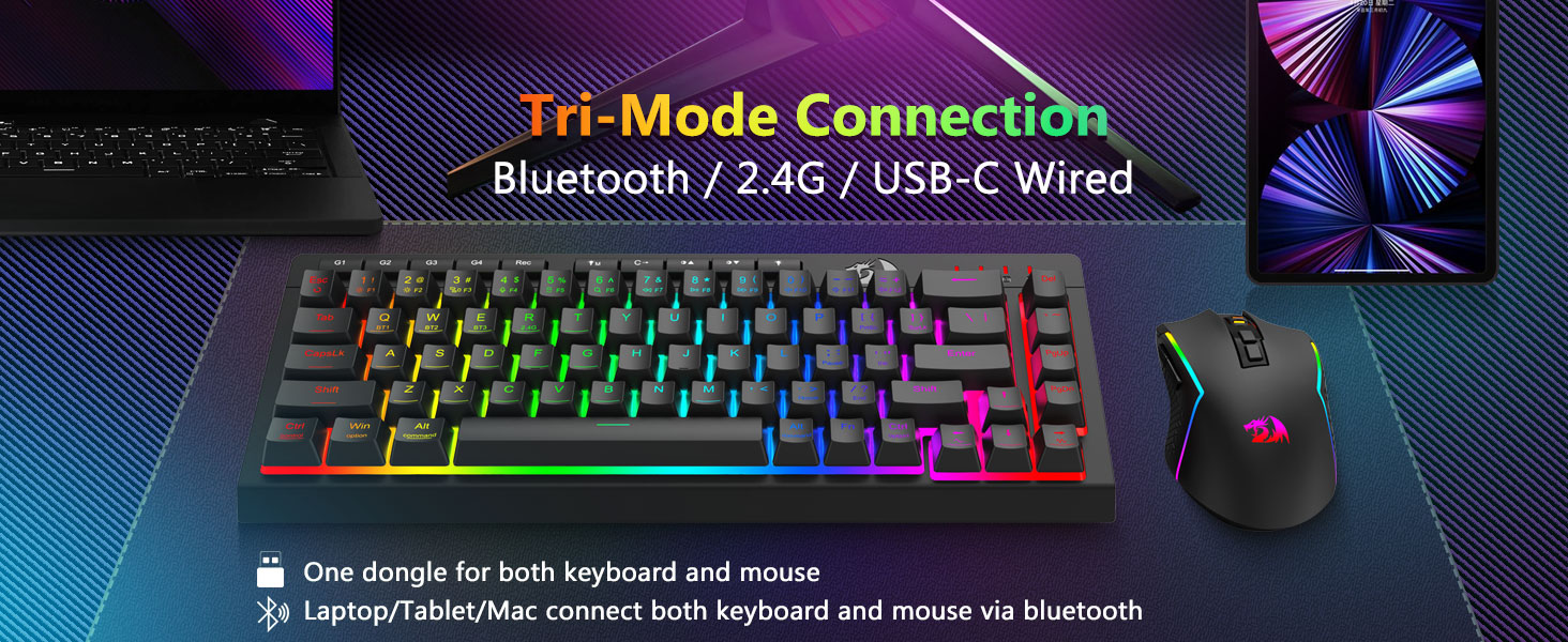Універсальная трохрэжымная клавіятура і мыш- Плаўна пераключайцеся паміж бесправадным рэжымам Bluetooth 5.0, 2,4 ГГц або правадным USB-C, падключаючыся да розных прылад (ПК, Mac, планшэты, тэлефоны, PS/XBOX). Лёгка перамыкайце прылады з дапамогай спалучэння клавіш або бакавой кнопкі — ідэальна падыходзіць для гібрыдных налад працы/гульні. Заставайцеся зараджанымі на працягу некалькіх тыдняў з акумулятарам клавіятуры на 4000 мАг і акумулятара мышы на 700 мАг (30+ дзён у рэжыме чакання, 50 гадзін працы RGB).