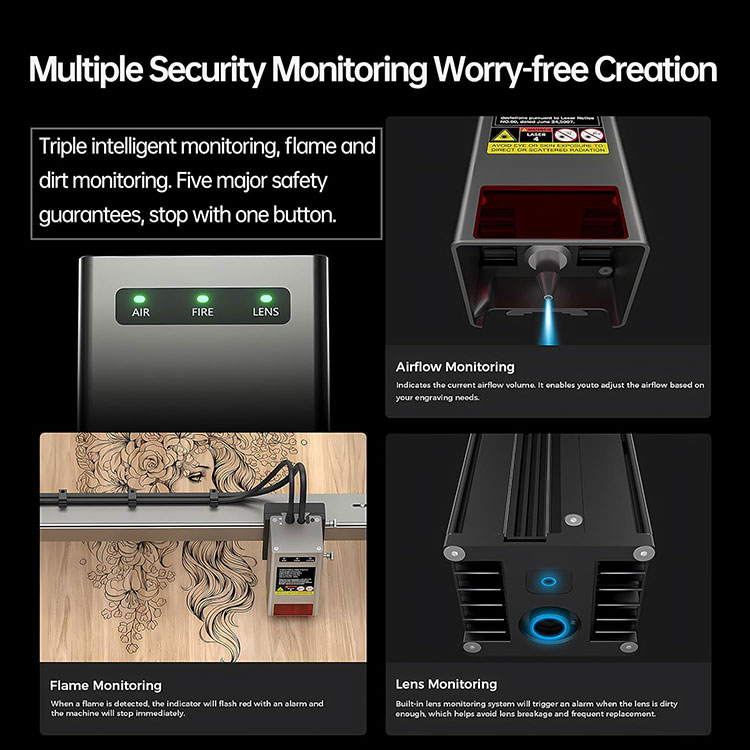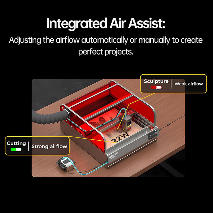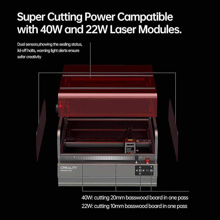 · ❤️ Закрыты дызайн з звышмагутнасцю рэзкі:Гравіроўка Creality Falcon2 Pro 22W з падвойнымі датчыкамі, якія паказваюць стан герметызацыі, прыпынкі пры адкрыцці вечка, сігнальныя сігналы, забяспечваюць больш бяспечную творчасць, якая можа выразаць 10-міліметровую дошку з ліпы за адзін праход. З Integrated Air Assist, які можа рэгуляваць паток паветра аўтаматычна або ўручную для стварэння ідэальных праектаў.
