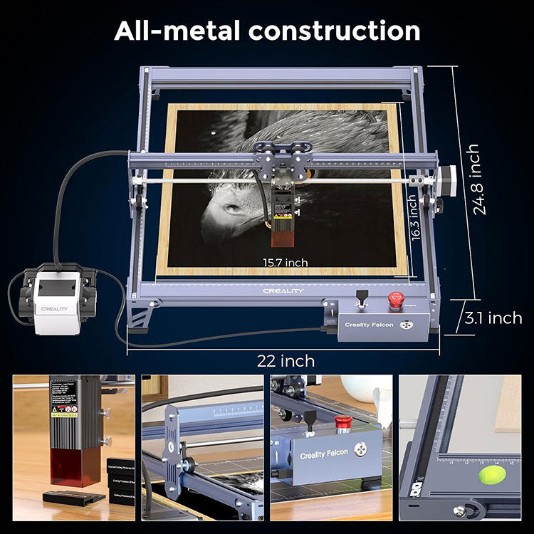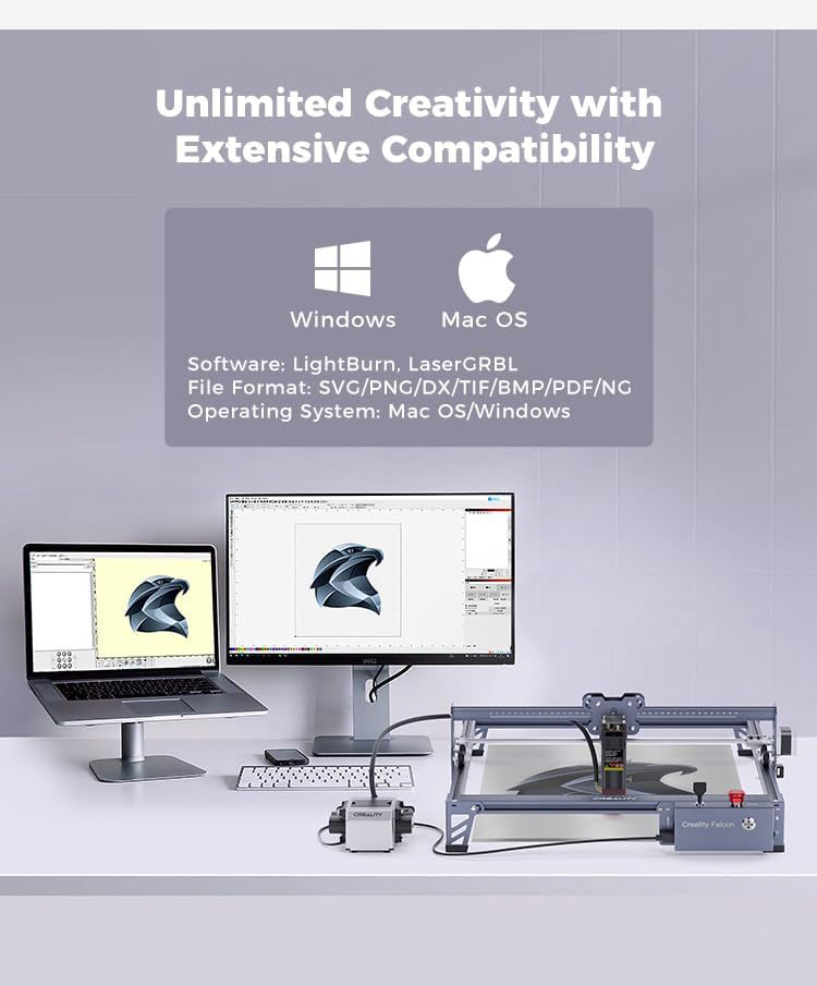 · 【Моцны і трывалы з дэталямі сумяшчальнасці】Дакладнасць і плыўнасць руху забяспечваюцца анадаванымі алюмініевымі сплавамі, L-вобразнымі сіліконавымі накладкамі і сталёвай рэйкай 8 мм. Убудаваны нівелір пазбягае слізгацення і адкалібраваны, каб вызначыць, ці правільна размешчана абсталяванне для лазернай гравіроўкі. Пасля атрымання пакета вы павінны ўсталяваць яго самастойна; гэта займае каля 10 хвілін. Лазерны гравер Creality falcon сумяшчальны з мноствам праграм для гравіроўкі, у тым ліку з LightBurn для дасведчаных карыстальнікаў лазераў і LaserGRBL для новых карыстальнікаў лазераў.
