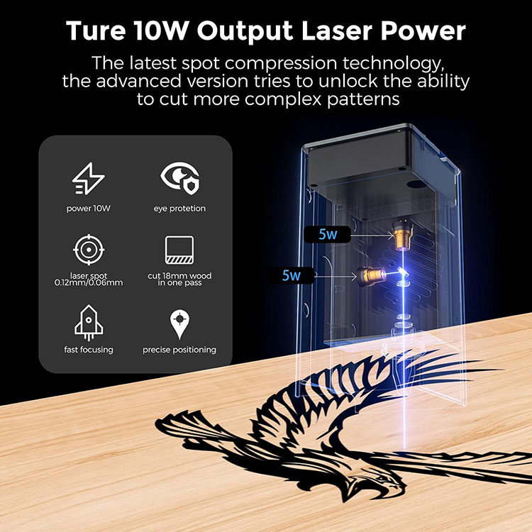 · 【Дакладная гравіроўка і рэзка】Тонкая кропкавая факусоўка 0,06 х 0,06 мм дазваляе дакладна кантраляваць дакладнасць гравіроўкі/рэзкі з дакладнасцю да 0,004 цалі і дакладнасць змены пазіцыі з дакладнасцю да 0,007 цалі. Падвойныя крокавыя рухавікі і ўбудаваная 32-бітная галоўная плата з убудаванай канструкцыяй з алюмініевага сплаву забяспечваюць стабільнасць падчас руху на высокай хуткасці. Пры адначасовым усталяванні параметраў можна таксама выгравіраваць маляўнічыя малюнкі.
