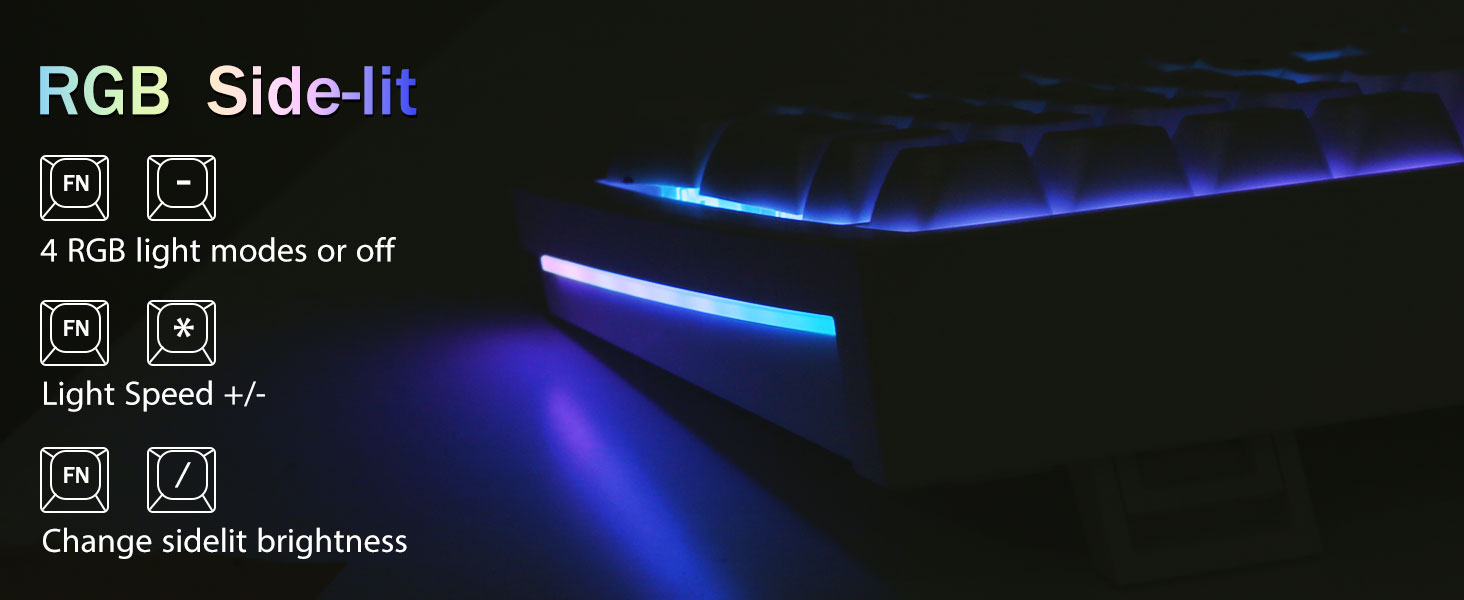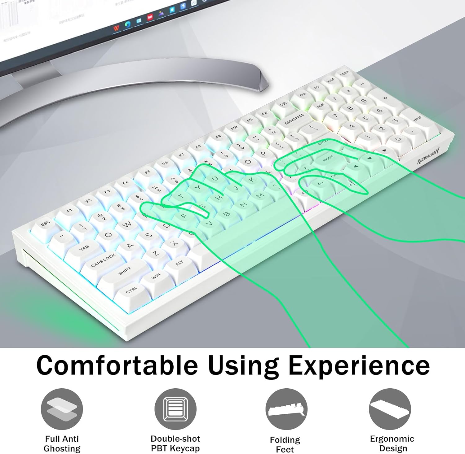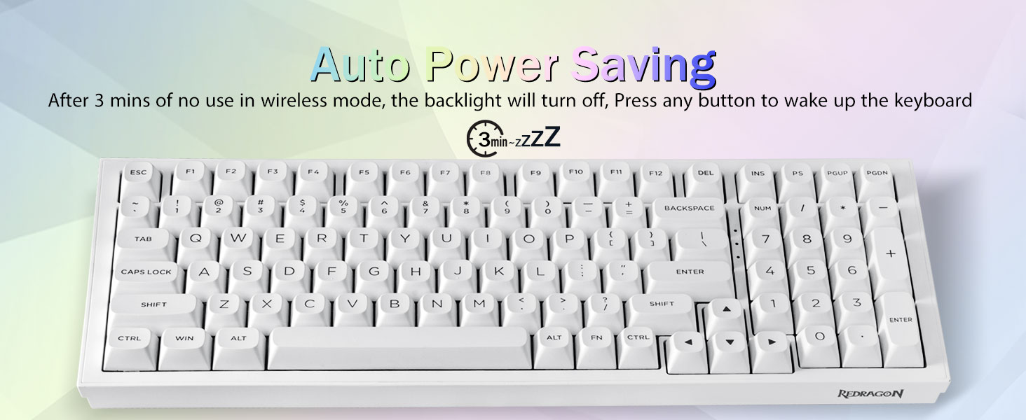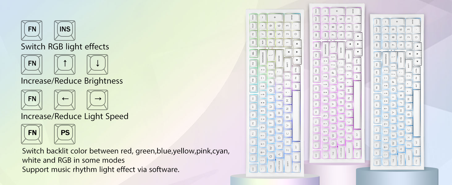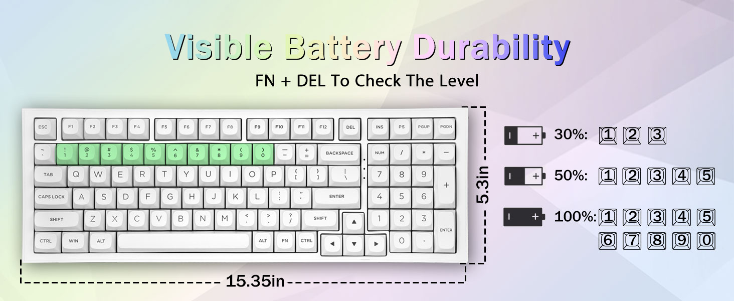 Клавішы PBT і батарэя 4000 мАг:Кампактная клавіятура з 99 клавішамі і 96% раскладкай можа зэканоміць больш месца на працоўным стале, захаваўшы неабходныя клавішы са стрэлкамі і вобласць лічбаў для гульняў і працы. Акумулятарная клавіятура ўбудавана ў акумулятар вялікай ёмістасці 4000 мАг, каб забяспечыць больш энергіі і працяглы час аўтаномнай працы. Падвойныя каўпачкі клавіш PBT, вырабленыя з двухколернага матэрыялу, улітага адзін у аднаго, дазваляюць сімвалам клавіш захоўваць яркасць і насычанасць, выразнасць і не знікаць.
