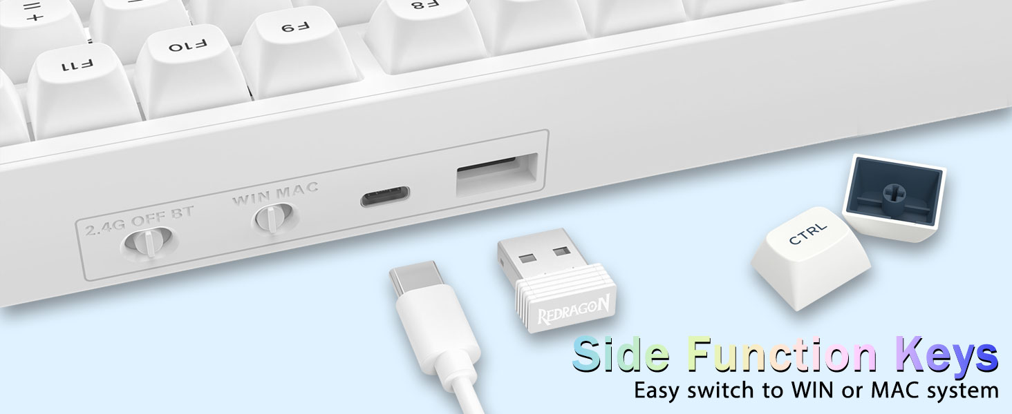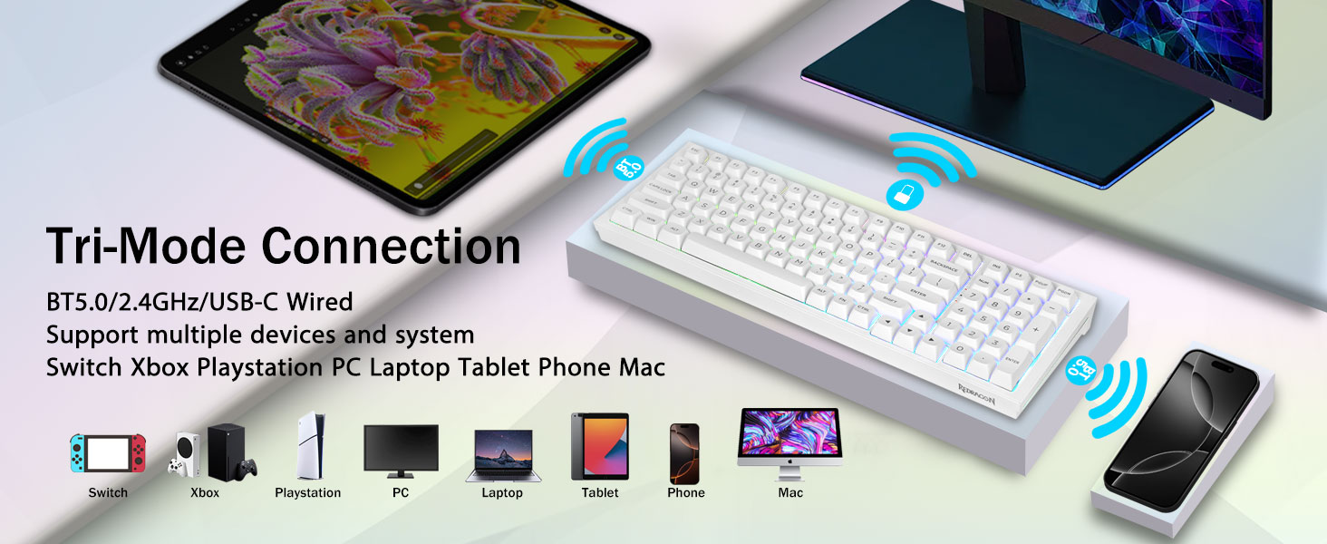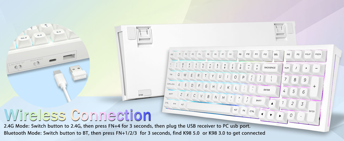 Падключэнне некалькіх прылад:Бесправадная механічная клавіятура Redragon K723 забяспечвае тры метады падключэння, у тым ліку BT5.0, бесправадны рэжым 2,4 ГГц і правадны USB. Ён можа быць падключаны да пяці прылад адначасова і лёгка пераключацца паміж імі з дапамогай FN і камбінацый клавіш. Няма абмежаванняў у падключэнні клавіятуры для задавальнення патрэб працы, гульняў і вучобы.