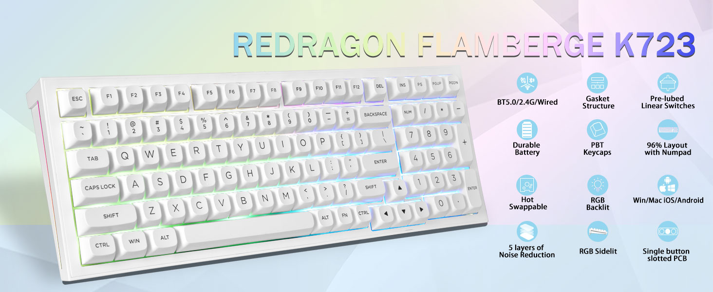 Chuangquan, вядучы кітайскі вытворца, з гонарам прадстаўляе бесправадную механічную гульнявую клавіятуру Redragon White Creamy K723 — шэдэўр, створаны для геймераў, якія не ідуць на кампраміс! Гэтая клавіятура забяспечвае неперасягненую прадукцыйнасць з надзвычай хуткім падключэннем да некалькіх прылад, магчымасцю гарачай замены і структурай пракладкі для гладкага націску клавіш. Папярэдне змазаныя пераключальнікі і яркая падсветка гарантуюць, што кожнае націсканне будзе дакладным і захапляльным. Як надзейная фабрыка, Chuangquan гарантуе канкурэнтаздольныя аптовыя цэны і падтрымку OEM/ODM для глабальных пастаўшчыкоў, якія шукаюць гульнявое абсталяванне вышэйшага ўзроўню. Палепшыце свой гульнявы працэс - крыніца непасрэдна з Chuangquan сёння!