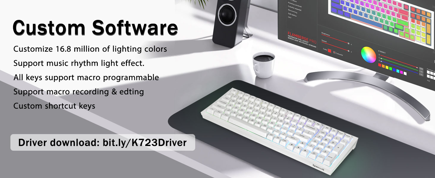 Карыстальніцкая клавіятура з магчымасцю гарачай замены:Перамыкачы і каўпачкі клавіш можна свабодна замяняць (крышка кнопак/здымнік пераключальнікаў уключаны ў камплект). Гэтая наладжвальная клавіятура з друкаванай платай з функцыяй гарачай замены дазваляе карыстальнікам лёгка замяняць 3-кантактныя/5-кантактныя перамыкачы без праблем з пайкай. Механічныя клавіятуры K723, абсталяваныя папярэдне змазанымі лінейнымі перамыкачамі, ствараюць гладкае адчуванне набору тэксту і прыемны гук, забяспечваюць хуткі адказ для захапляльнай гульні