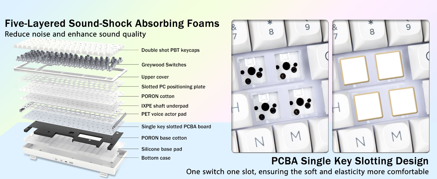Структура пракладкі і друкаваная плата з адным ключом:Гэтая камп'ютэрная клавіятура мае структуру пракладкі, пашыраную інтэграваную сіліконавую пракладку і прарэз для адной клавішы на друкаванай плаце, што лепш аптымізуе ўстойлівасць і стабільнасць, робячы руку больш мяккай і эластычнай. Пяць слаёў напаўняльнага глушыцеля запаўняюць шчыліну паміж друкаванай платай, пазіцыянуючай пласцінай і валам, эфектыўна супрацьдзейнічаючы шуму, які ўзнікае ў паражніны вала ад удару вала аб пазіцыянуючую пласціну, і забяспечваючы цвёрдае адчуванне.