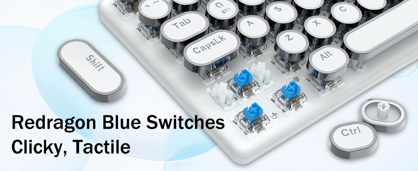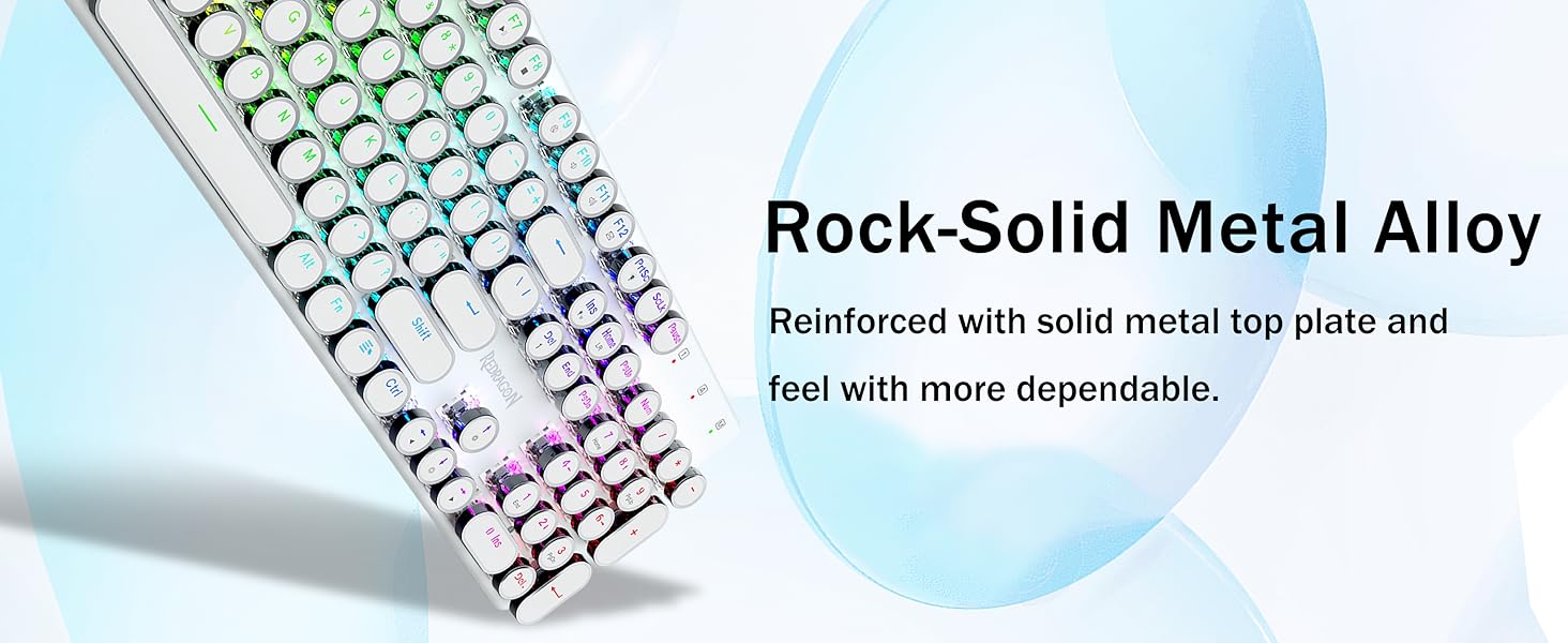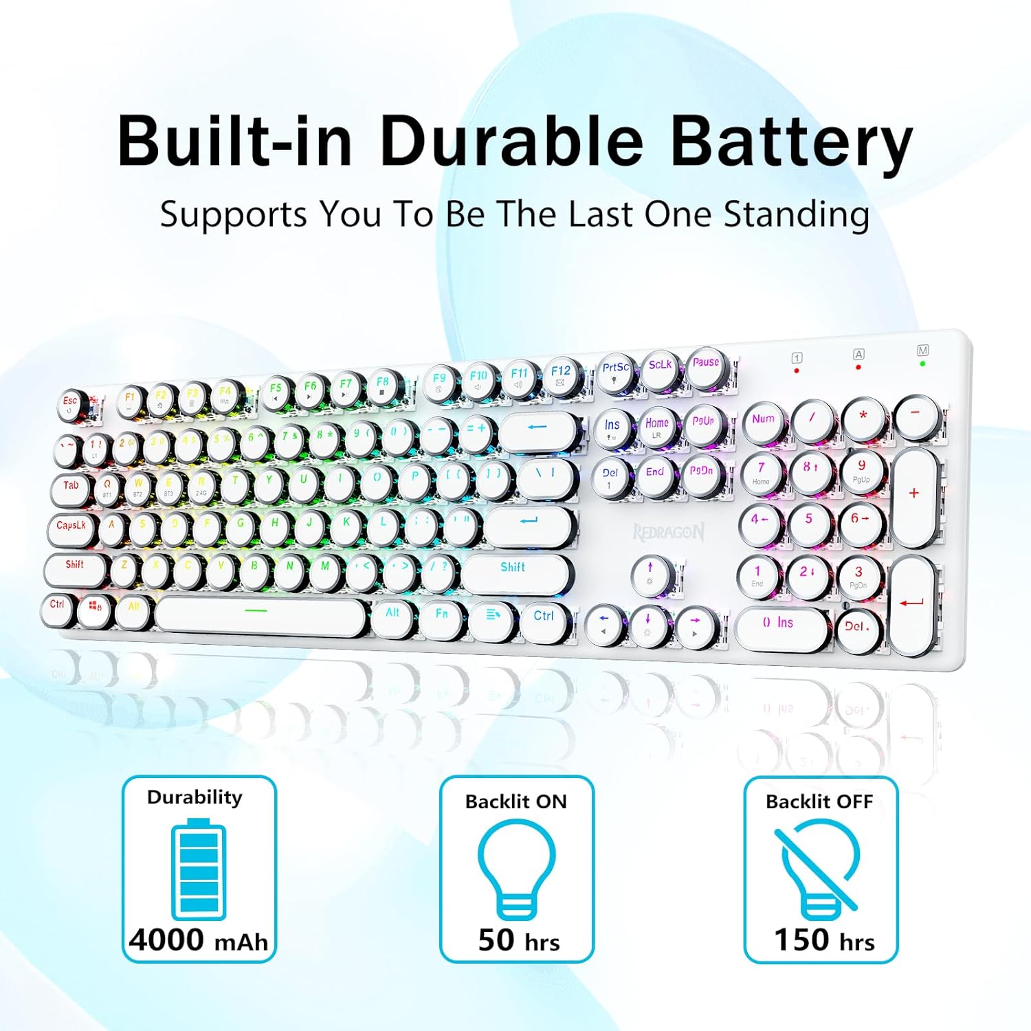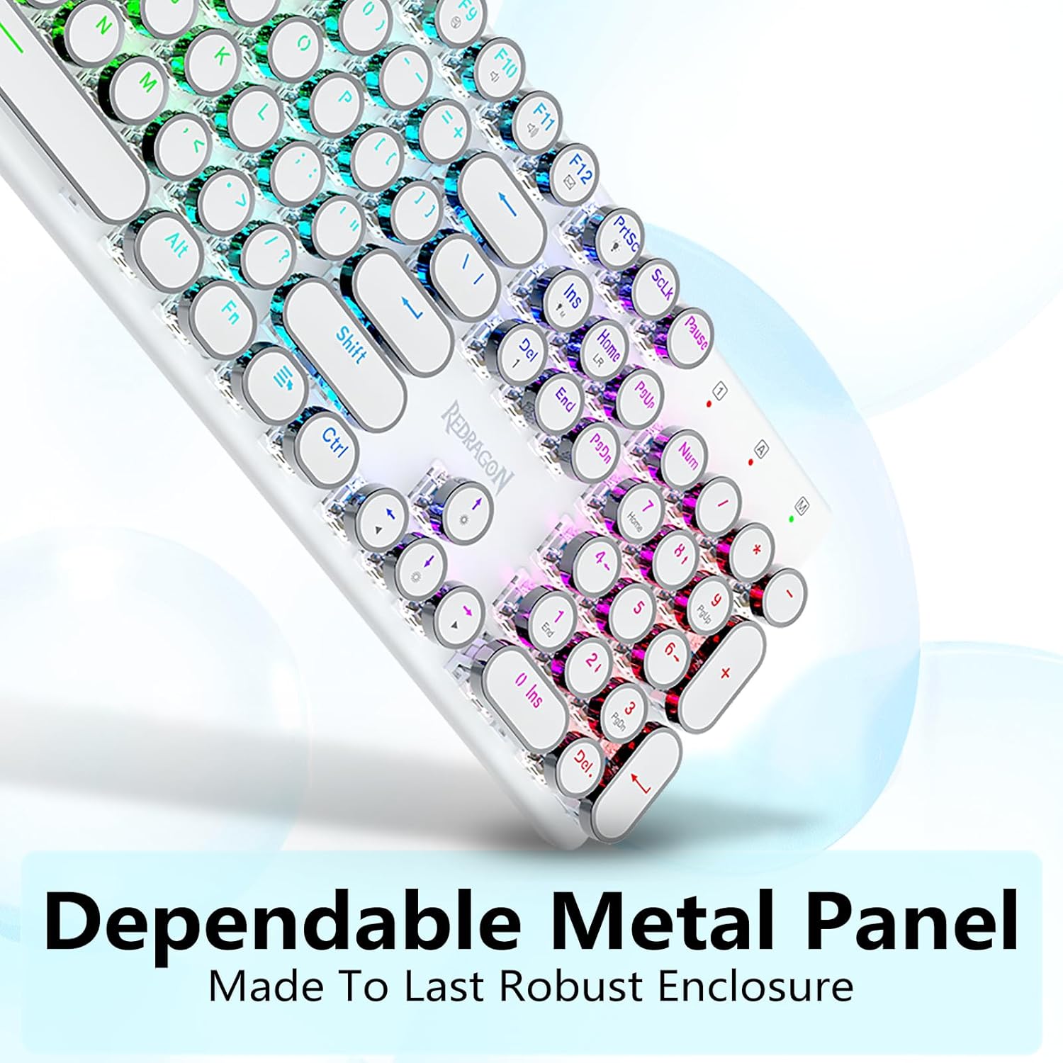 𝗣𝗿𝗼 𝗦𝗼𝗳𝘁𝘄𝗮𝗿𝗲 𝗦𝘂𝗽𝗽𝗼𝗿𝘁𝗲𝗱- Механічныя блакітныя перамыкачы Redragon забяспечваюць сярэднюю ўстойлівасць, чутны гук пстрычкі і тактыльную зваротную сувязь, забяспечваюць хуткае і дакладнае гульнявое асяроддзе і прадукцыйнасць. Вінтажная клавіятура ў стылі стымпанк з круглымі каўпачкамі выглядае як класічная пішучая машынка, забяспечвае камфортнае адчуванне набору тэксту і стабільнае націсканне.