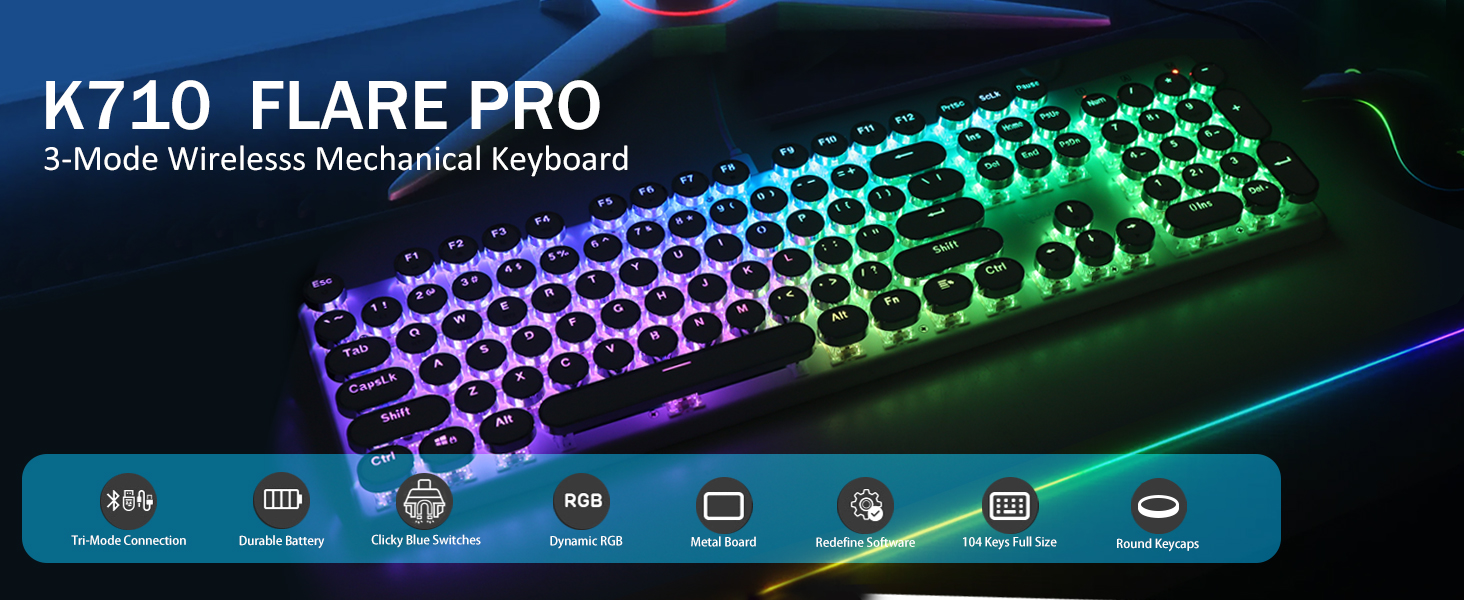 𝗗𝗲𝗽𝗲𝗻𝗱𝗮𝗯𝗹𝗲 𝗠𝗲𝘁𝗮𝗹 𝗣𝗮𝗻𝗲𝗹 & 𝟭𝟬𝟰 𝗞𝗲𝘆𝘀 𝗔𝗻𝘁𝗶 𝗚𝗵𝗼𝘀𝘁𝗶𝗻𝗴- Абноўленая версія FLARE PRO працягвае выкарыстоўваць той жа цвёрды металічны матэрыял. Трымайце клавіятуру ўстойлівай і элегантнай на стале, каб набіраць тэкст прэміум-класа. Клавіятура K710 падтрымлівае 104-клавішную тэхналогію anti-ghosting, якая дазваляе націскаць некалькі клавіш адначасова без канфліктаў.