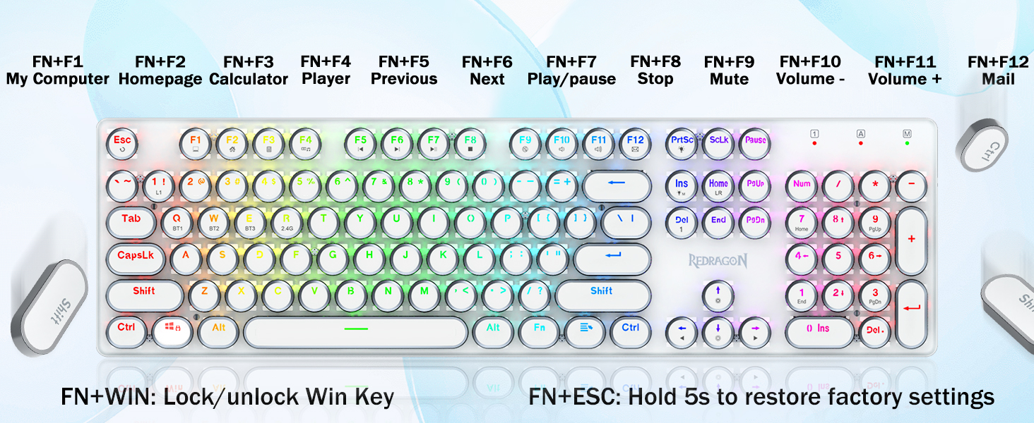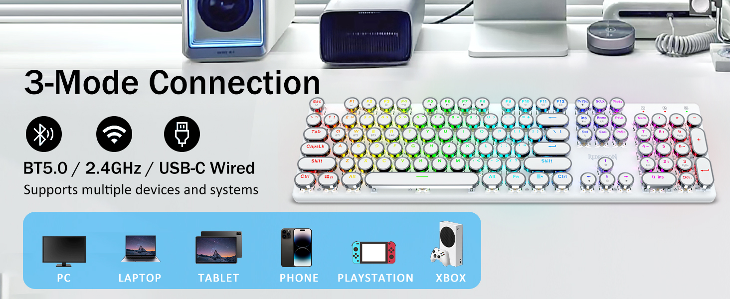 𝟯-𝗠𝗼𝗱𝗲 𝗖𝗼𝗻𝗻𝗲𝗰𝘁𝗶𝗼𝗻- Абсталяваны інавацыйнай тэхналогіяй трохрэжымнага злучэння Redragon, правадным USB-C, бесправаднымі рэжымамі Bluetooth 3.0/5.0 і 2,4 ГГц, якія павышаюць карыстацкі досвед на новы ўзровень ва ўсіх сферах. Націсніце FN+Q/W/E, каб перайсці ў рэжым Bluetooth, націсніце FN+R, каб перайсці ў рэжым 2,4G.